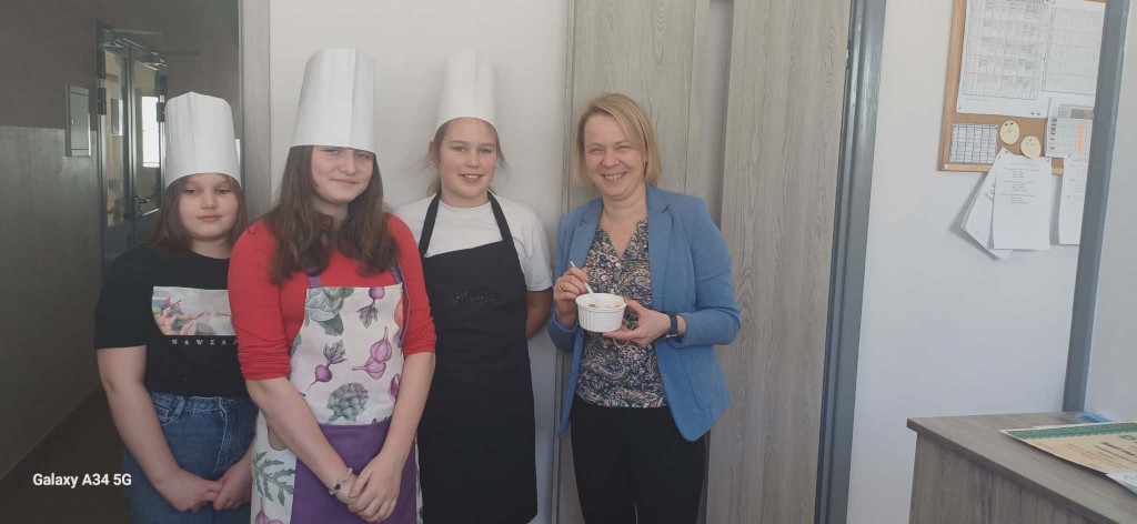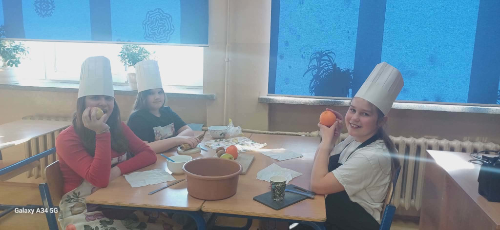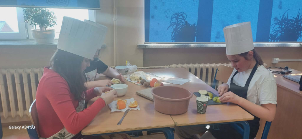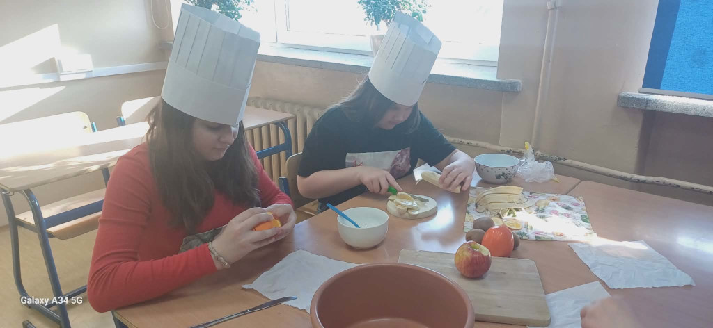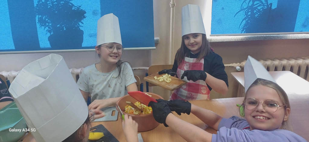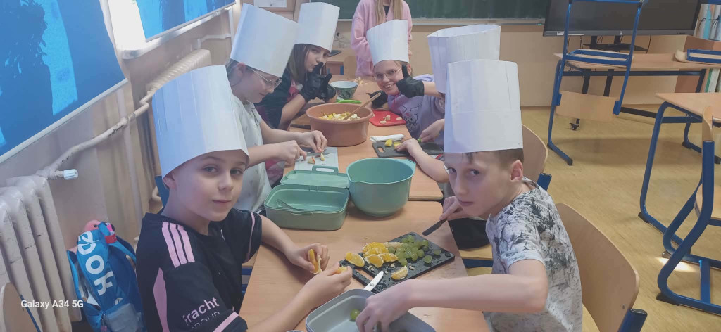 Na lekcji edukacji zdrowotnej uczniowie klas 4 i 5 uczestniczyli w zajęciach praktycznych, podczas których przygotowywali owocową sałatkę. Było to jednocześnie podsumowanie wiedzy o naturalnych witaminach i zdrowym odżywianiu. Dzieci z zaangażowaniem pracowały, poznając wartości odżywcze owoców oraz ucząc się zasad higieny i współpracy. Nauka przez działanie okazała się smaczna, kolorowa i bardzo pyszna!