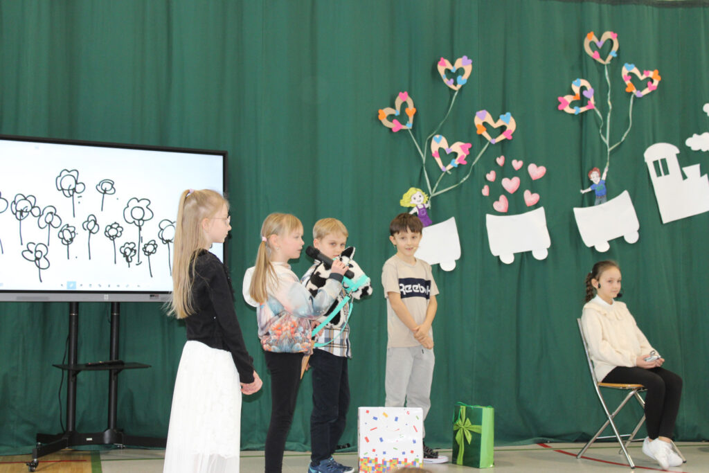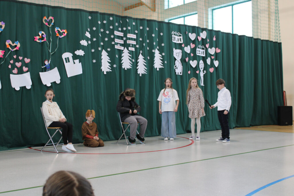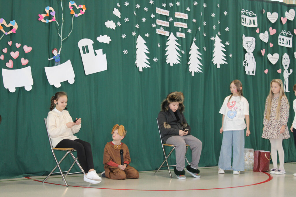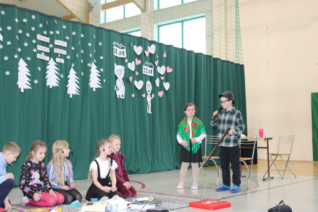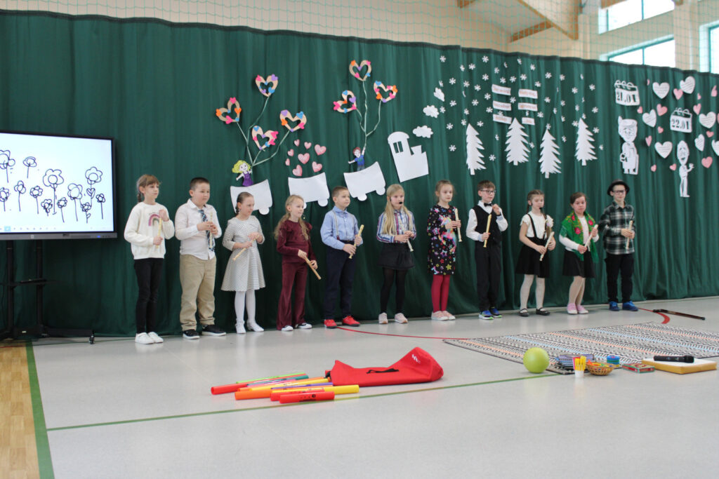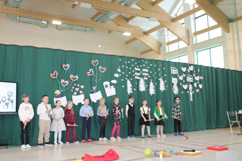 Nie zabrakło wzruszających podziękowań dla Babć i Dziadków, którym dzieci zadedykowały także symboliczną, narysowaną na tablicy kwietną łąkę. Pierwszoklasiści zachwycili występem tanecznym, a młodzi muzycy zaprezentowali utwory grane na flecie oraz bum-bum rurkach. Publiczność z uśmiechem obejrzała także scenki teatralne w wykonaniu drugoklasistów oraz trzecioklasistów — o tym, co potrafi wydarzyć się w domu, gdy rodzice mają „wychodne”, a opiekę przejmują dziadkowie, oraz pouczającą historię pokazującą, że również dorośli mogą czasem zbyt mocno „zagubić się” w świecie Internetu.