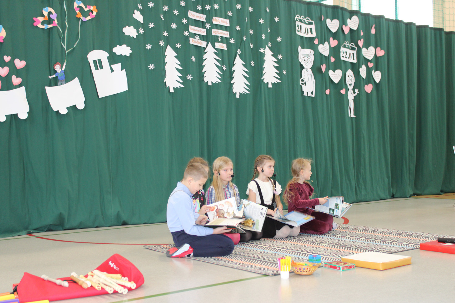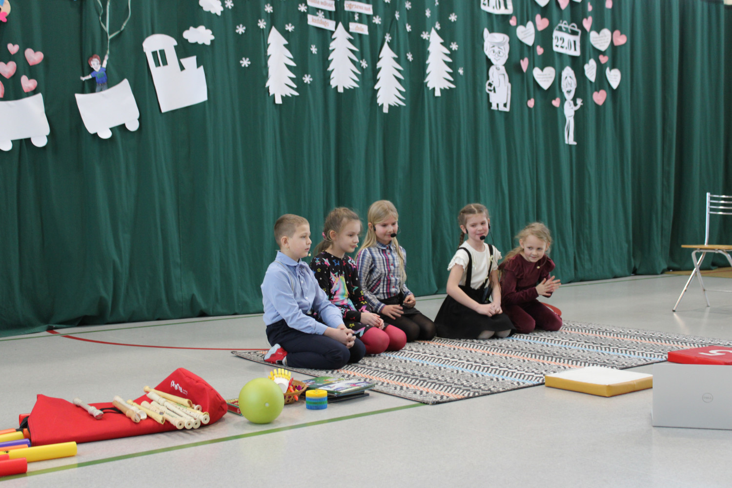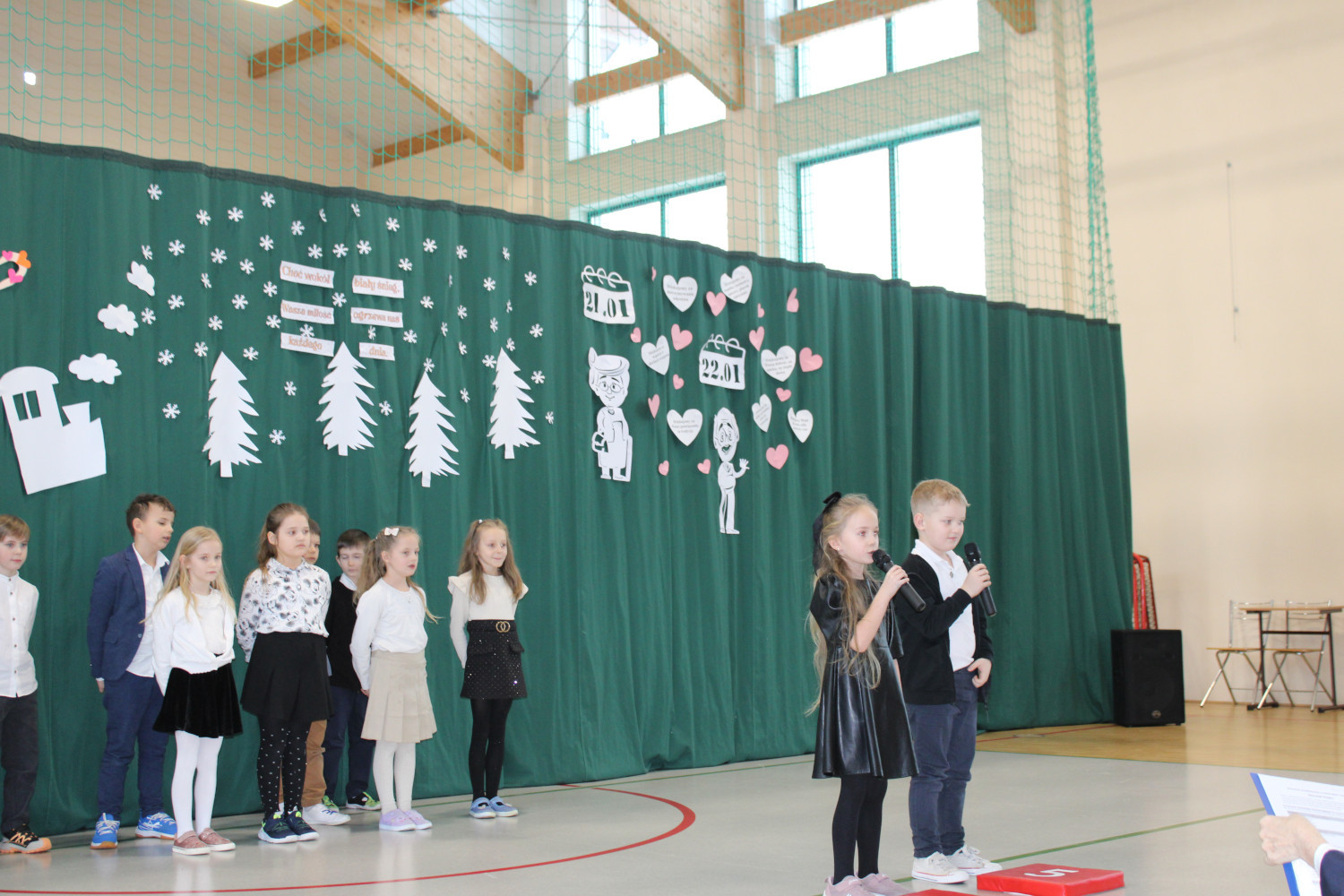 Nie zabrakło wzruszających podziękowań dla Babć i Dziadków, którym dzieci zadedykowały także symboliczną, narysowaną na tablicy kwietną łąkę. Pierwszoklasiści zachwycili występem tanecznym, a młodzi muzycy zaprezentowali utwory grane na flecie oraz bum-bum rurkach. Publiczność z uśmiechem obejrzała także scenki teatralne w wykonaniu drugoklasistów oraz trzecioklasistów — o tym, co potrafi wydarzyć się w domu, gdy rodzice mają „wychodne”, a opiekę przejmują dziadkowie, oraz pouczającą historię pokazującą, że również dorośli mogą czasem zbyt mocno „zagubić się” w świecie Internetu.
