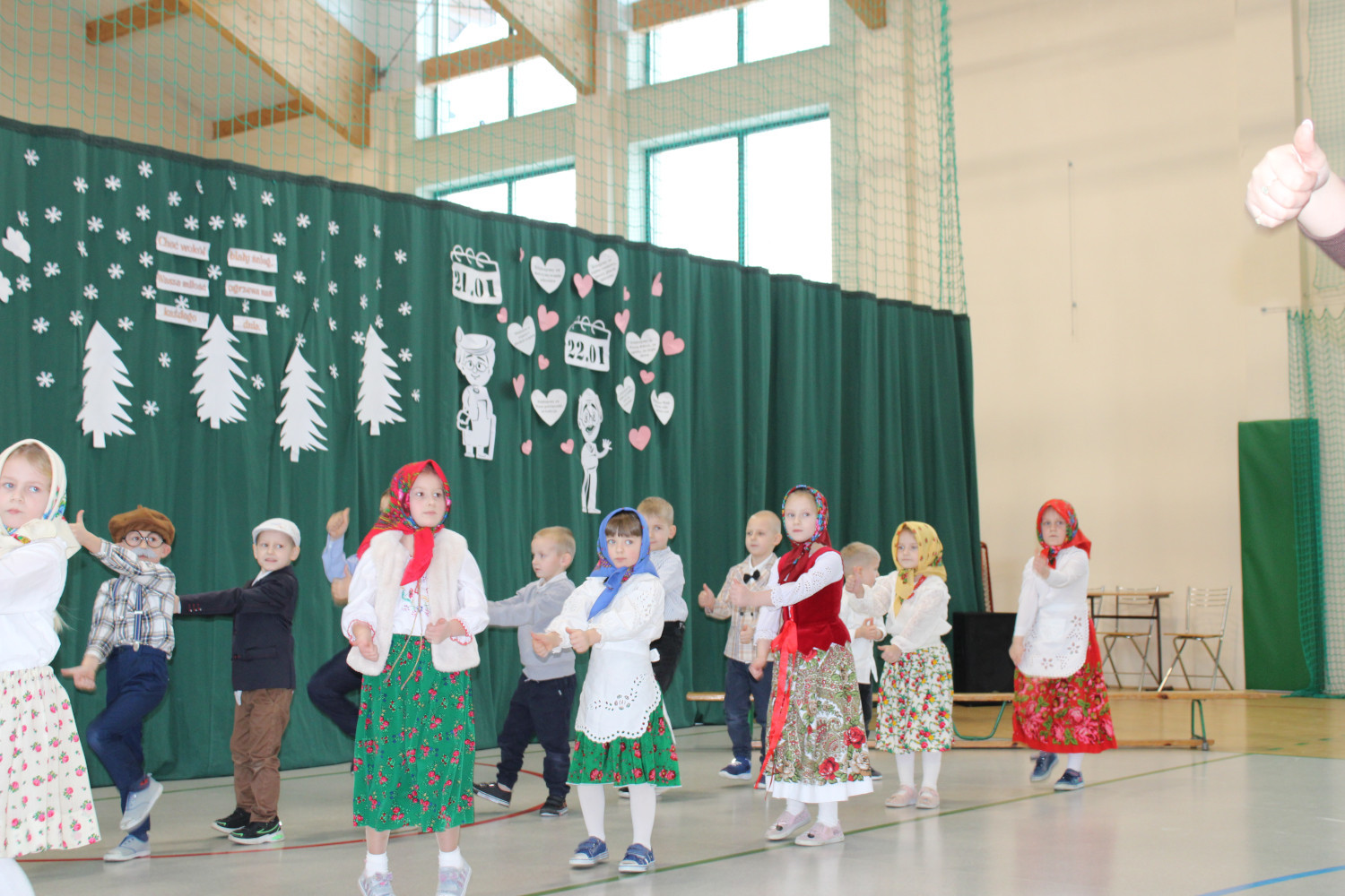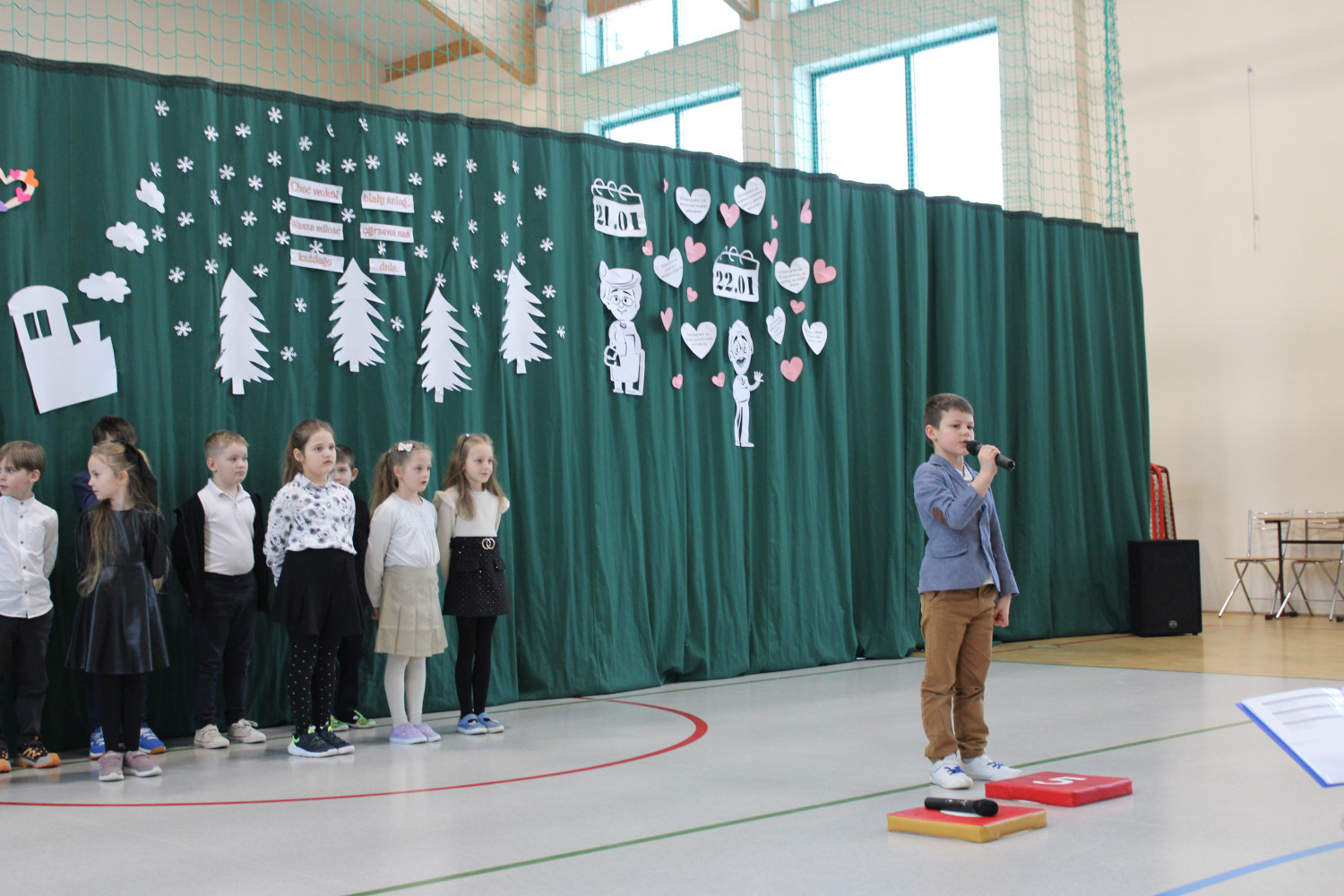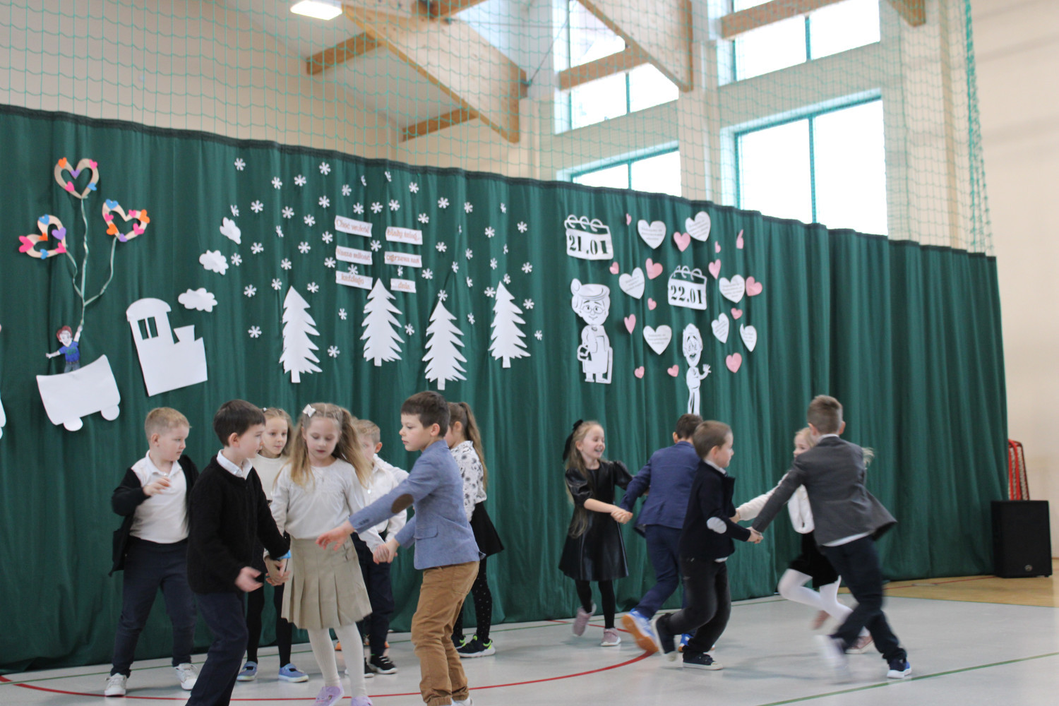 Następnie na scenie prezentowały się kolejne grupy — od oddziału przedszkolnego aż po klasę trzecią. Program artystyczny był niezwykle bogaty i różnorodny. Publiczność mogła podziwiać występy taneczne, muzyczne i teatralne. Szczególne emocje wzbudził humorystyczny taniec „babć” w wykonaniu najmłodszych, które — zachęcone przez „dziadków” — porzuciły laski i kule, prezentując prawdziwy pokaz tanecznej energii: od spokojnego walca aż po żywiołowy taniec hip-hopowy.