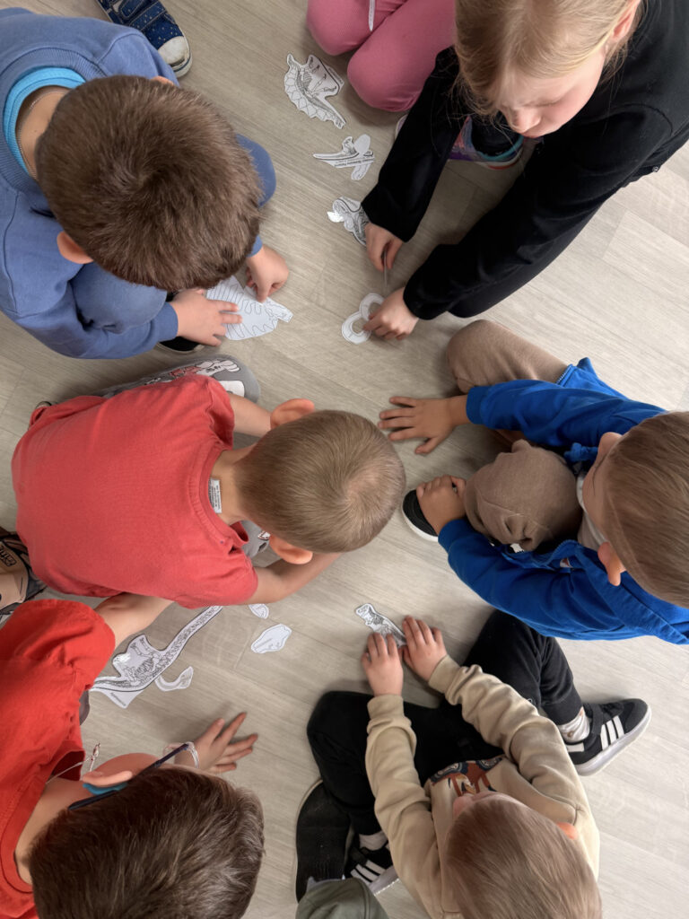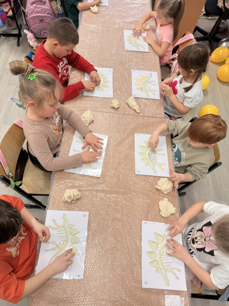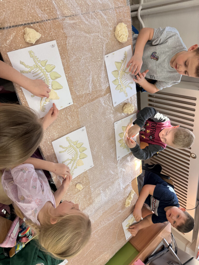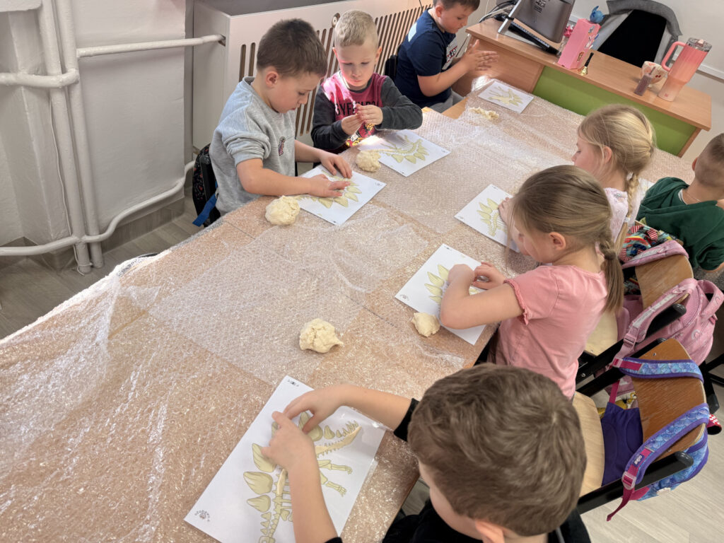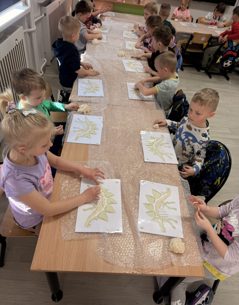 W minionym tygodniu w grupie przedszkolaków królowały dinozaury. Z okazji Dnia Dinozaura dzieci przez cały tydzień poznawały fascynujący świat prehistorycznych gadów poprzez zabawę, doświadczenia i różnorodne aktywności. Podczas zajęć wykonaliśmy wiele prac plastycznych i technicznych inspirowanych dinozaurami. Jednym z ciekawszych zadań było tworzenie szkieletów dinozaurów z masy solnej, które wymagało od dzieci dużej kreatywności i zaangażowania. Korzystając z pięknej pogody, dużo czasu spędzaliśmy również na świeżym powietrzu. Przed szkołą dzieci rysowały kredą kolorowe dinozaury na kostce brukowej, zamieniając szkolne podwórko w prawdziwy prehistoryczny świat. Podczas zajęć dzieci miały także okazję obejrzeć skamieniałości oraz różne ciekawe kamienie, dzięki czemu mogły poczuć się jak mali odkrywcy i paleontolodzy.