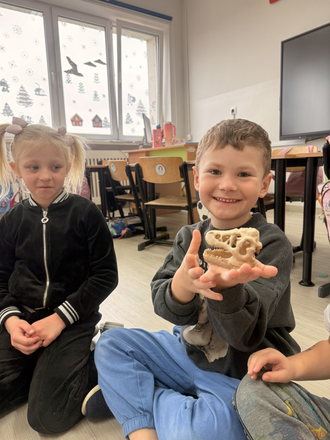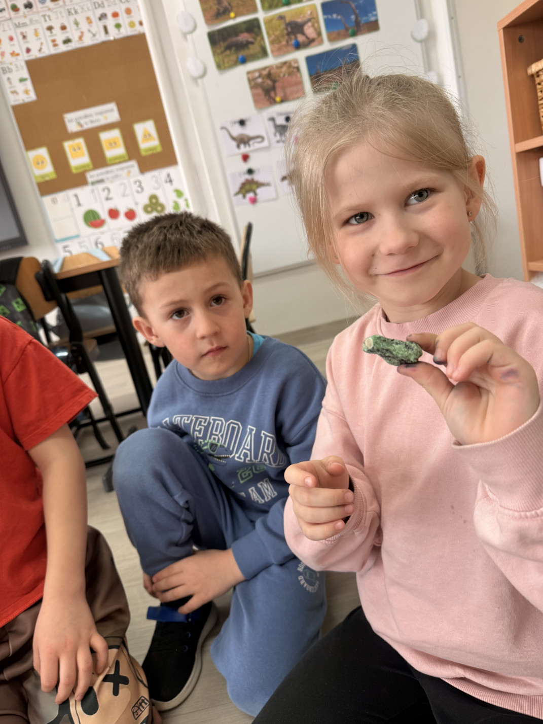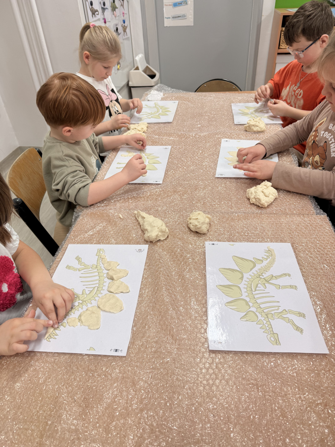 W minionym tygodniu w grupie przedszkolaków królowały dinozaury. Z okazji Dnia Dinozaura dzieci przez cały tydzień poznawały fascynujący świat prehistorycznych gadów poprzez zabawę, doświadczenia i różnorodne aktywności. Podczas zajęć wykonaliśmy wiele prac plastycznych i technicznych inspirowanych dinozaurami. Jednym z ciekawszych zadań było tworzenie szkieletów dinozaurów z masy solnej, które wymagało od dzieci dużej kreatywności i zaangażowania. Korzystając z pięknej pogody, dużo czasu spędzaliśmy również na świeżym powietrzu. Przed szkołą dzieci rysowały kredą kolorowe dinozaury na kostce brukowej, zamieniając szkolne podwórko w prawdziwy prehistoryczny świat. Podczas zajęć dzieci miały także okazję obejrzeć skamieniałości oraz różne ciekawe kamienie, dzięki czemu mogły poczuć się jak mali odkrywcy i paleontolodzy.