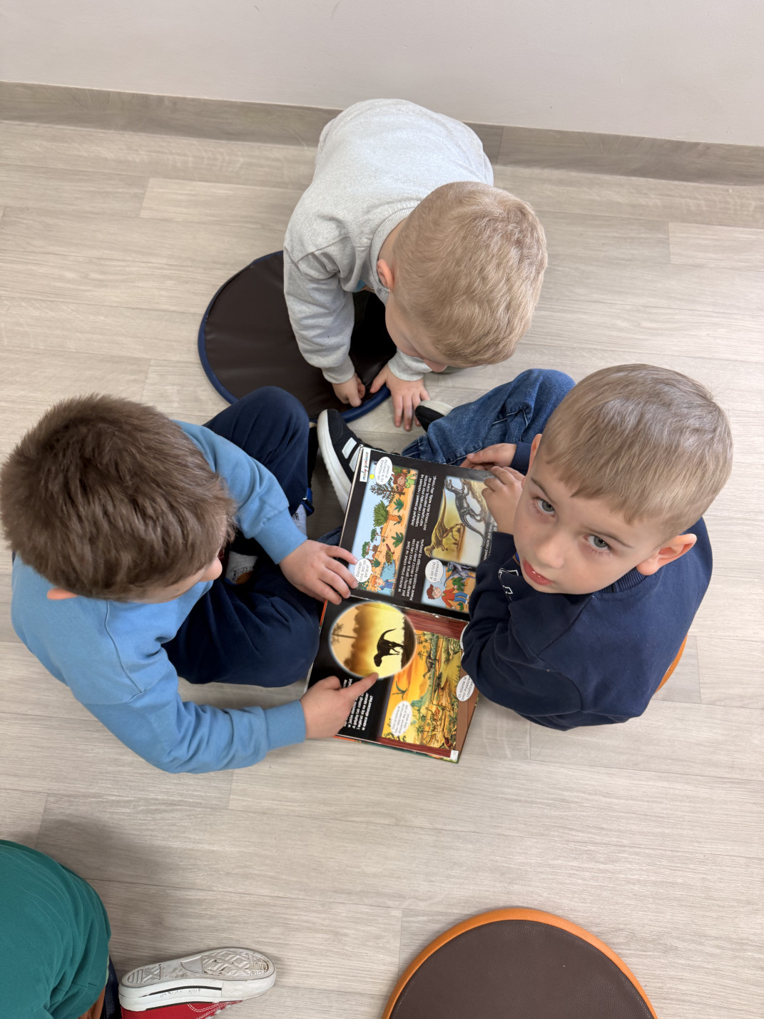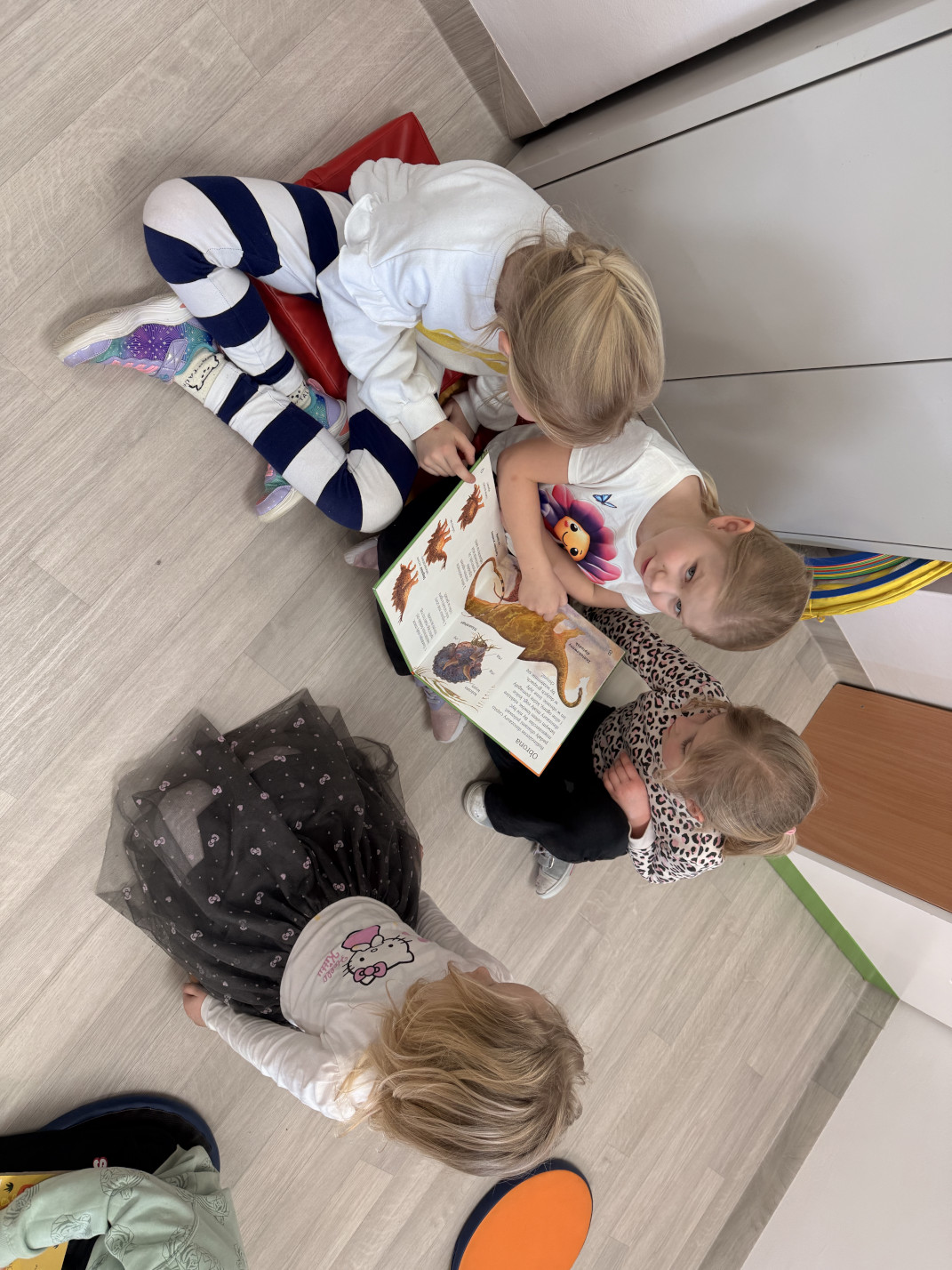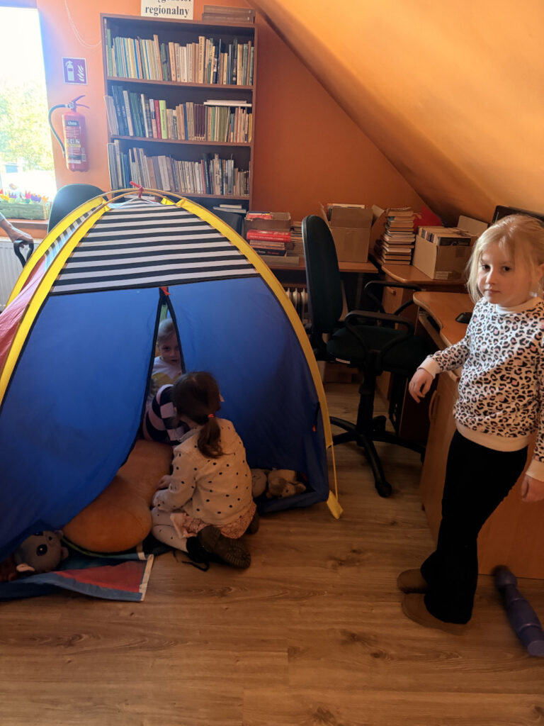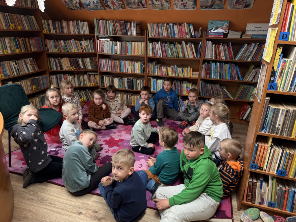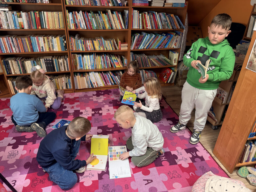 Nie zabrakło również wyjścia edukacyjnego. Odwiedziliśmy bibliotekę na pobliskiej remizie, gdzie dowiedzieliśmy się więcej o zawodzie bibliotekarza oraz poznaliśmy wiele ciekawostek o dinozaurach. Wypożyczyliśmy także książki o tej tematyce, aby dalej zgłębiać wiedzę w naszej sali. Pani Czesia przygotowała dla dzieci również zabawy i aktywności związane z dinozaurami, które sprawiły wszystkim dużo radości.
