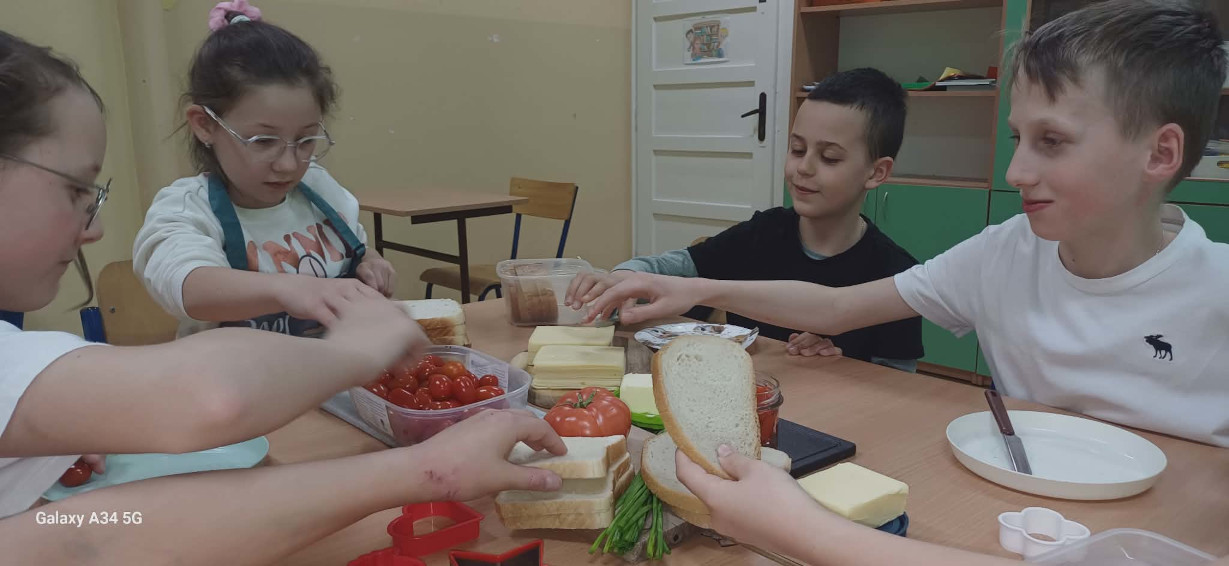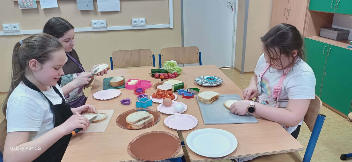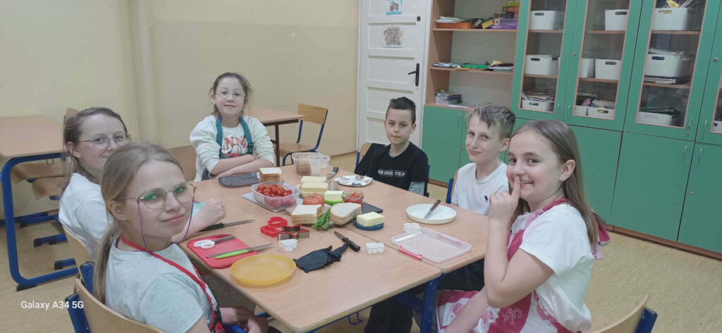 Na zajęciach z edukacji zdrowotnej w ramach zajęć projektowych uczniowie przygotowywali zdrowe, kolorowe kanapki oraz domową lemoniadę. Podczas pracy było dużo współpracy, kreatywności i rozmów o zdrowym odżywianiu. Okazało się, że dzieci bardzo dobrze czują się w roli kucharzy i z dużym zaangażowaniem przygotowywały swoje potrawy. Na koniec oczywiście przyszedł czas na wspólną degustację, która sprawiła wszystkim dużo radości.