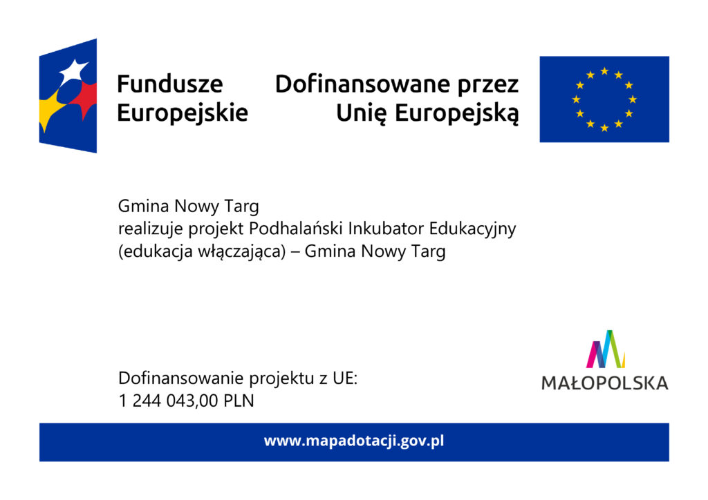 Gmina Nowy Targ realizuje projekt unijny pn. „Podhalański Inkubator Edukacyjny (edukacja włączająca) – Gmina Nowy Targ” w ramach programu Fundusze Europejskie dla Małopolski 2021-2027, Priorytet 6 Fundusze Europejskie dla rynku pracy, edukacji i włączenia społecznego, Działanie 6.30 Wsparcie kształcenia ogólnego.